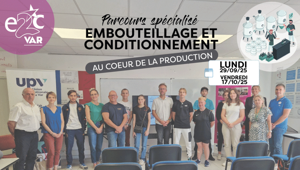 Le parcours spécialisé « Embouteillage et Conditionnement » du 29 septembre au 17 octobre 2025 à l’E2C Brignoles s’adresse aux jeunes de 18 à 25 ans souhaitant découvrir les métiers de ce secteur et s’y insérer professionnellement.